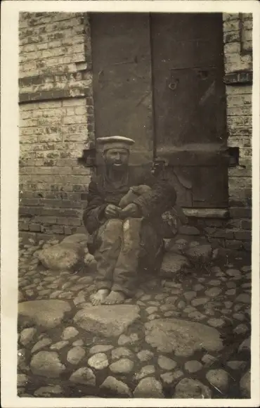 Foto Ak Russland ?, Mann vor einem Gebäude, Bettler ?