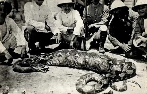Foto Ak Schlange, Jäger, Python mit verschluckter Beute