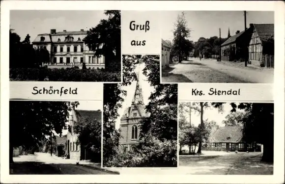 Foto Ak Schönfeld Steinfeld Bismark in der Altmark, Teilansichten, Kirche, Straßenpartie