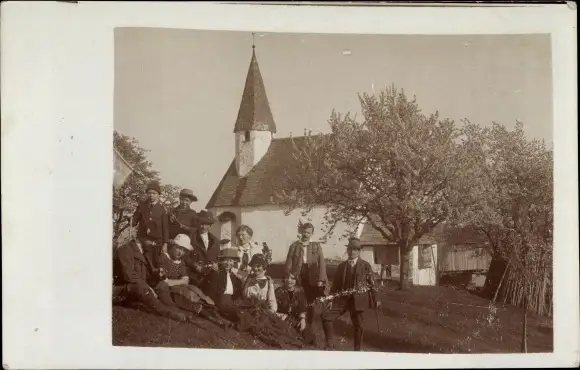 Foto Ak Schweiz, Menschengruppe vor einer Kirche