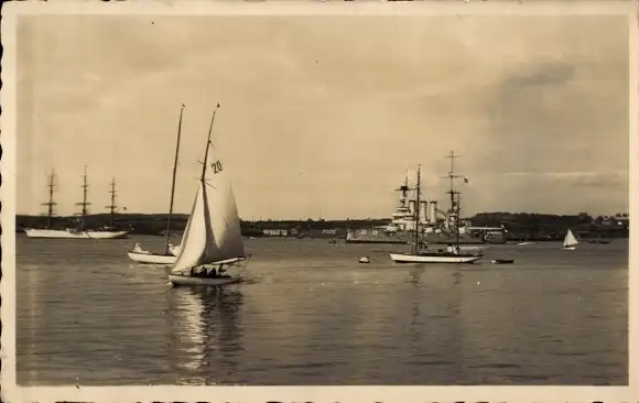 Foto Ak Segelboot, Segelschiff, Kriegsschiff im Hintergrund, Clarita