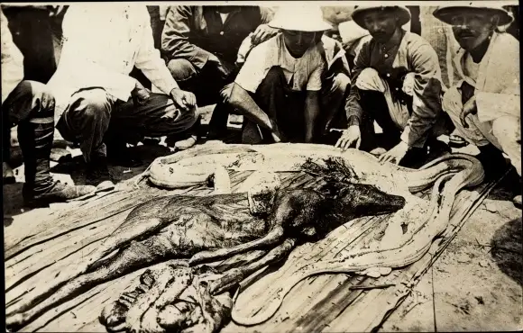 Foto Ak Singapore, Singapur, Schlange, Jäger, Python mit herausgeschnittener Beute