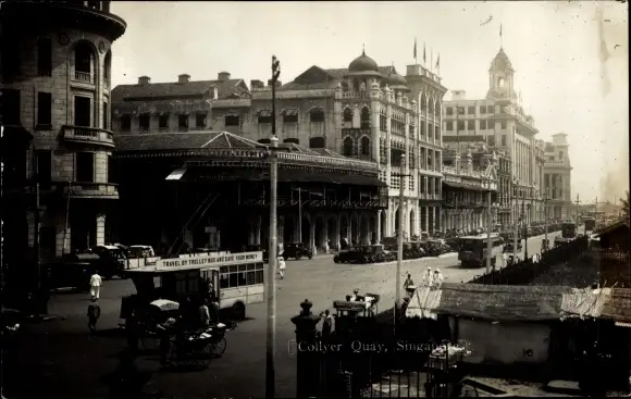 Foto Ak Singapur, Collyer Quay, Oberleitungsbus, Kolonialgebäude