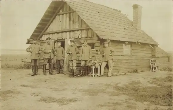 Foto Ak Soldaten in Uniform, Hütte, Gruppenbild