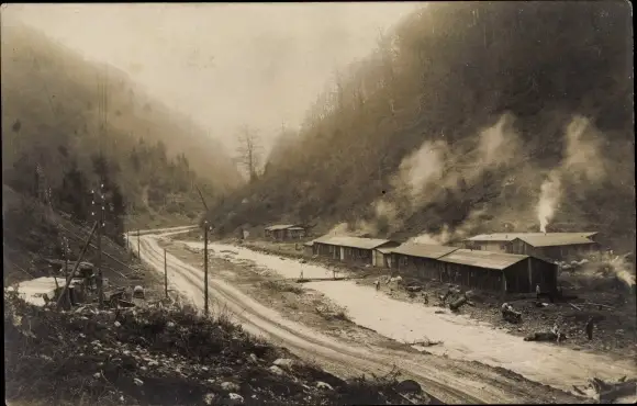 Foto Ak Soldatenbaracken in einem Tal, I. WK