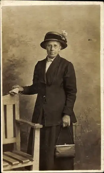 Foto Ak Standportrait einer Frau mit Hut und Handtasche