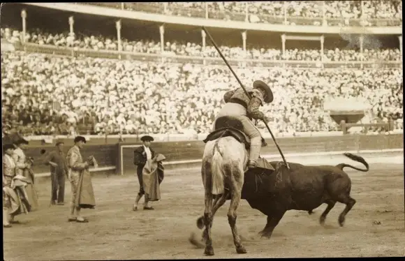 Foto Ak Stierkampf, Torero, Stier, Reiter, Lanze