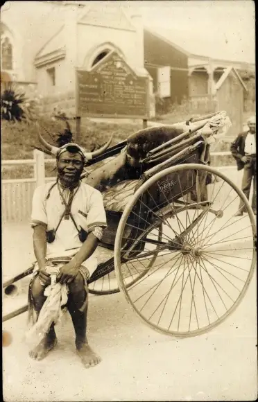 Foto Ak Südafrika, Rikscha, Mann mit Hörnerhelm