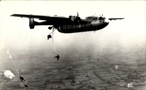 Foto Ak Transportflugzeug, Militärflugzeug, Fallschirmjäger beim Absprung