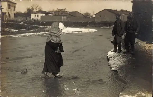 Foto Ak Überschwemmter Ort, Männer in Uniformen, Anwohnerin