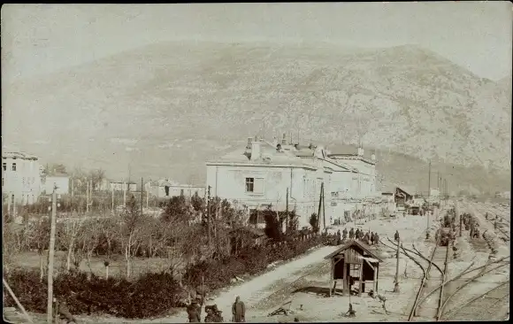 Foto Ak Unbekannter Ort, Bahnhof im Bau, Gleisseite