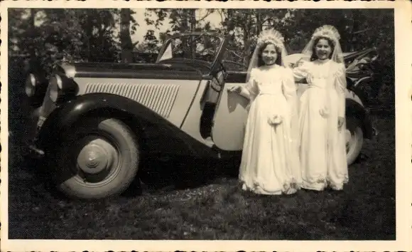 Foto Ak Zwei Mädchen in weißem Kleidern, Auto, Feier