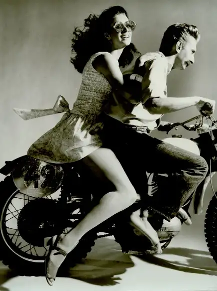 Foto Arwa Lady Charming kini, Frau und Mann auf einem Motorrad, Reklame