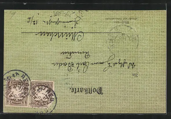 Personenbezogene Daten auf der Rückseite der Karte wurden durch blauen Textmarker unkenntlich gemacht. Die blauen Stellen sind auf die Vorderseite durchgeweicht und wirken sich negativ auf das Postkartenfoto aus
