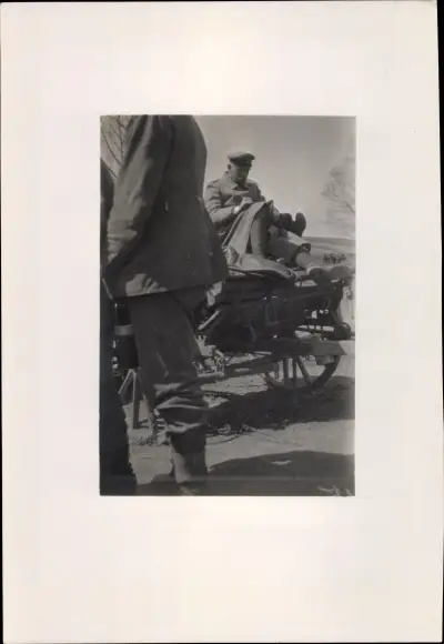 Foto Deutscher Soldat in Uniform auf einem Karren schreibt einen Brief