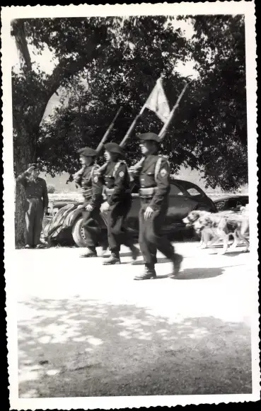 Foto Drei französische Soldaten in Uniformen, Hunde, Auto, Gebirgsjäger