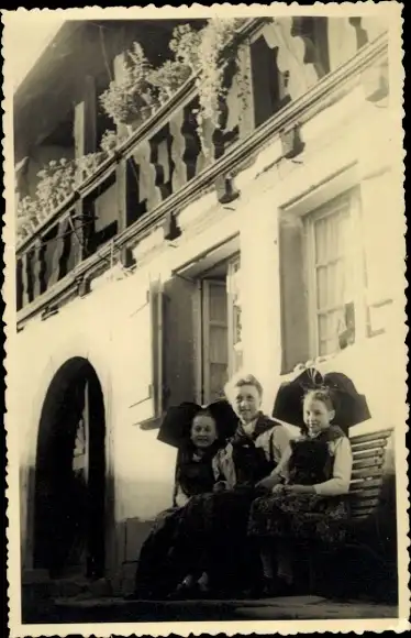 Foto Elsässerinnen am Haus, Oma, Enkeltöchter, Elsässer Tracht