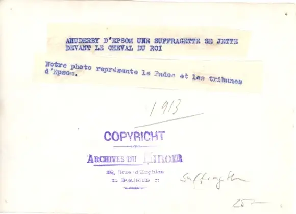 Foto Epsom Surrey England, Une Suffragette se jette devant le Cheval du Roi, 1913