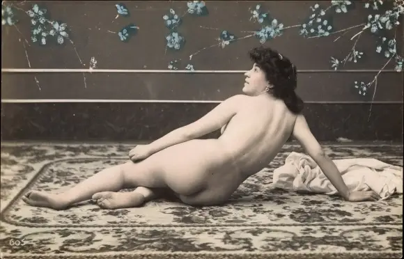 Foto Erotik, Frau auf einem Teppich sitzend, Frauenakt, Rückansicht