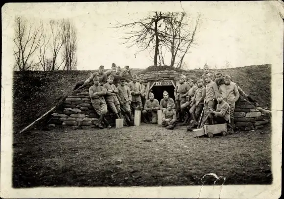 Foto Frankreich, Unterstand, I. WK, Französische Soldaten in Uniformen