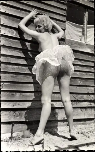 Foto Frauenakt, nackte Frau an einer Holzhütte posierend, Po, Rock