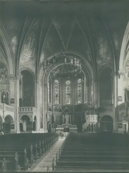 Foto Innenansicht eines Doms, Altar, Kanzel, Gebetsbänke