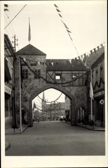 Foto Leisnig in Sachsen, Straßenpartie, Tor, Festschmuck