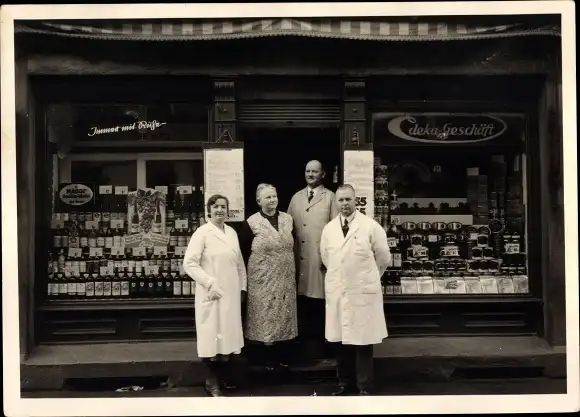 Foto Männer und Frauen vor einem Geschäft, Deka, Schaufenster, Verkäufer