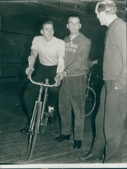 Foto Radrennsport, Bahnradfahrer mit verbundenen Armen, Trainer