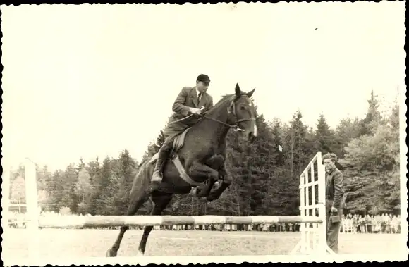Foto Springreiten, Mann zu Pferde, Hürdensprung