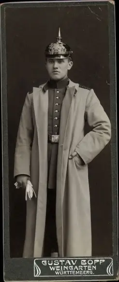 Foto Standportrait, Soldat, Kaiserreich, Uniform, Mantel, Pickelhaube, Handschuhe