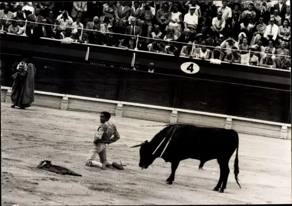 Foto Stierkampf, Picador kniet, Stier, Stadion, Zuschauer