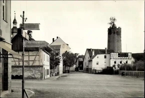 Foto Triptis in Thüringen, Schlossturm, Straßenpartie, Wegweiser zur Reichsautobahn
