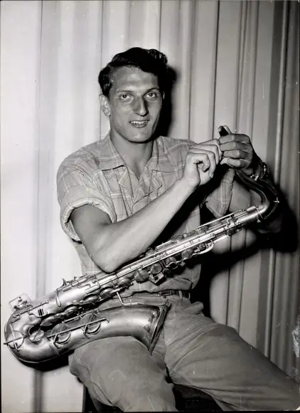 Foto Zehnkämpfer Martin Lauer mit Saxophon, Portrait