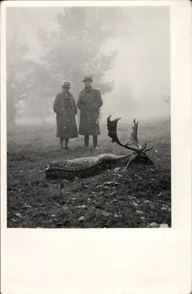 Foto Zwei Jäger, erlegter Hirsch