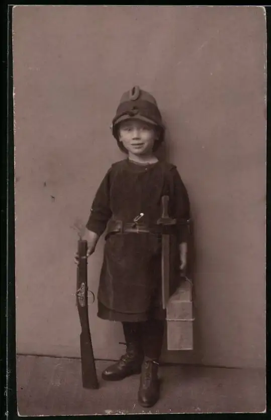 Fotografie 1.WK, Kind mit Vorderlader-Gewehr, Flinte & Kurzschwert