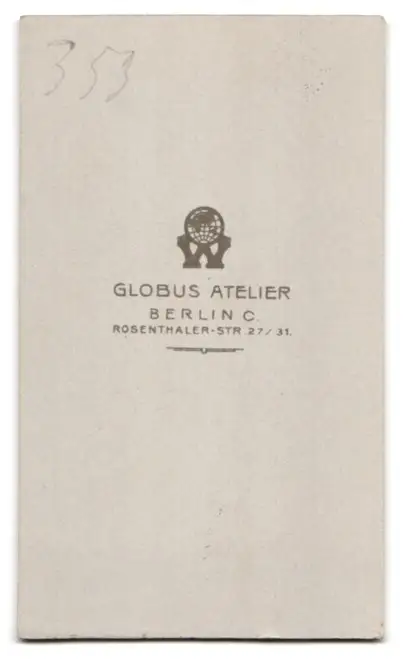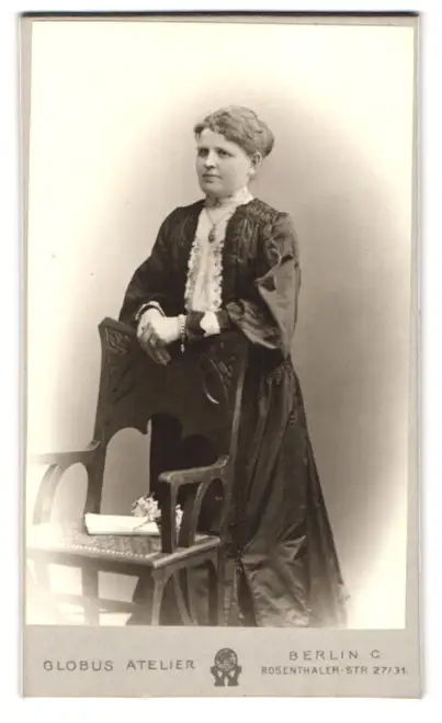 Fotografie Atelier Globus, Berlin-C., Rosenthaler-Str. 27-31, Portrait bürgerliche Dame lehnt am Stuhl