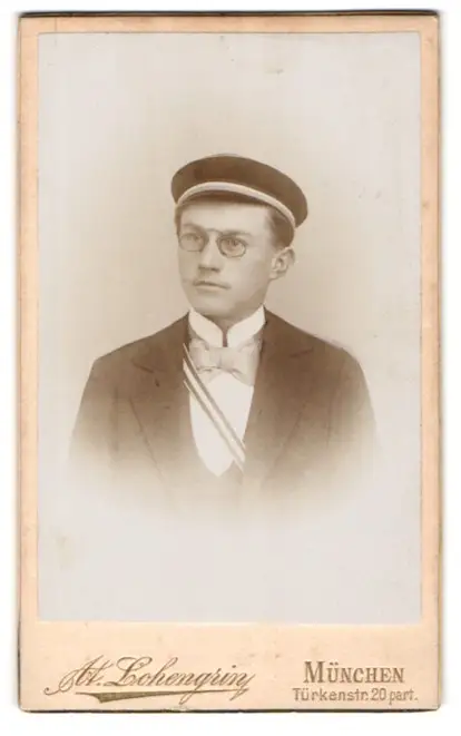 Fotografie Atelier Lohengrin, München, Türkenstr. 20, junger Student im Anzug mit Couleur und Schirmmütze