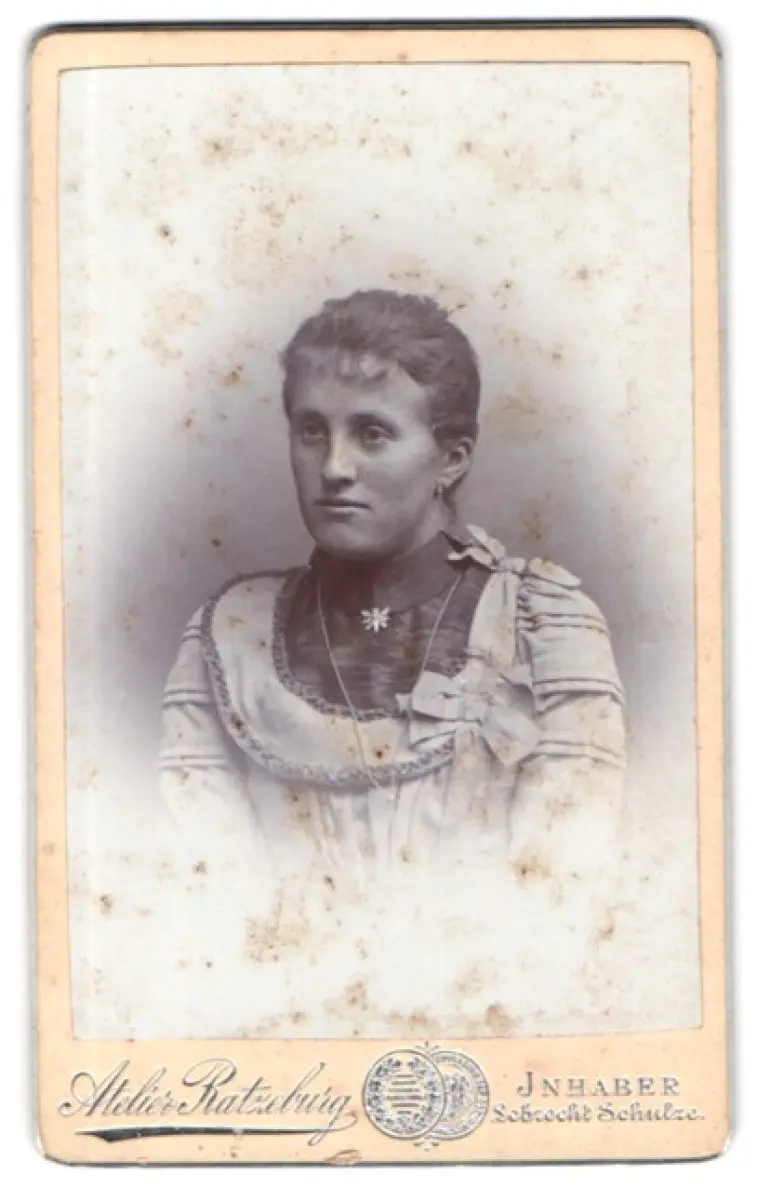 Diese CDV Fotografie zeigt das Porträt einer ernst blickenden Frau. Sie trägt ein fein verziertes Kleid mit einer dekorativen Brosche am Kragen. Ihr Haar ist elegant hochgesteckt. Die sanfte Unschärfe des Hintergrundes hebt die Figur anmutig hervor und verleiht dem Bild eine zeitlose Eleganz., guter Zustand