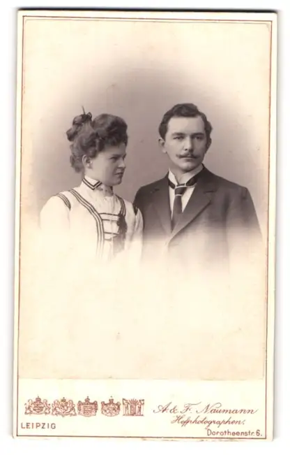Fotografie A.&F. Naumann, Leipzig, Dorotheenstr. 6, Frau mit Dutt guckt Mann mit Schnauzbart an
