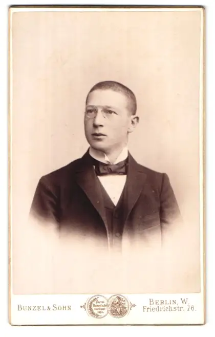 Fotografie Bunzel & Sohn, Berlin, Friedrichstr. 76, Junger Mann im Anzug mit Zwicker