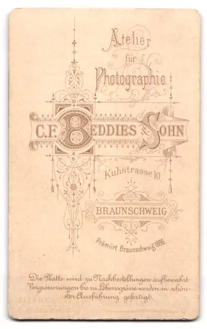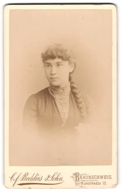Fotografie C. F. Beddiens & Sohn, Braunschweig, Portrait junges Mädchen im Kleid mit geflochtenem Zopf