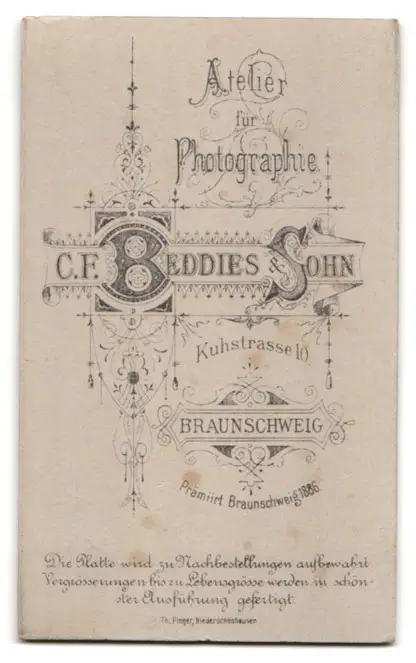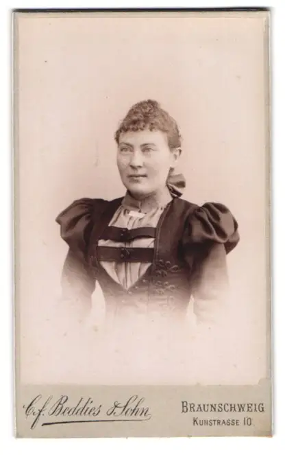 Fotografie C. F. Beddies & Sohn, Braunschweig, Kuhstrasse 10, Portrait junge Dame im modischen Kleid
