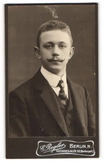 Fotografie C. Regler, Berlin, junger Mann Max Doboszewicz im Anzug mit Mustasch