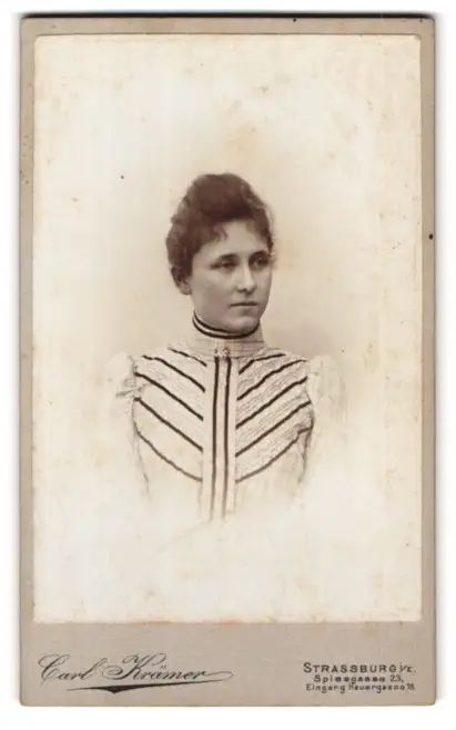 Fotografie Carl Krämer, Strassburg i / E., Spiesgasse 23, Portrait junge Dame im modischen Kleid