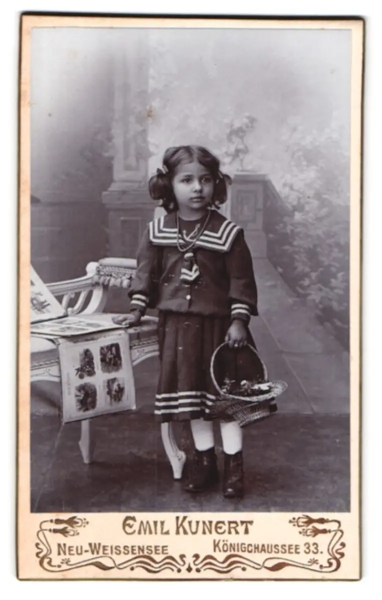 In dieser CDV Fotografie ist ein junges Mädchen zu sehen, das in einem anmutigen Matrosenkleid mit zarten Verzierungen gekleidet ist. Sie steht neben einer kunstvoll gestalteten Bank, auf der Bilder ausgebreitet sind. In ihren kleinen Händen hält sie einen Korb voller Blumen, der sanft an ihrer Seite ruht. Der Hintergrund zeigt eine angedeutete Naturkulisse, die dem Bild eine zeitlose Eleganz verleiht., guter Zustand