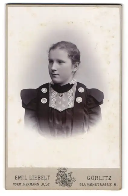 Fotografie Emil Liebelt, Görlitz, Blumenstrasse 8, Junge Dame im Kleid mit Zierknöpfen und Spitzenbesatz