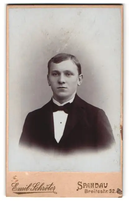 Fotografie Emil Schröter, Berlin-Spandau, Breitestrasse 32, Portrait junger Herr im Anzug mit Fliege
