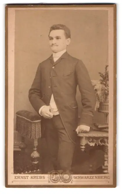 Fotografie Ernst Krebs, Schwarzenberg, Junger Mann mit Schnurrbart und aufrechter Haltung