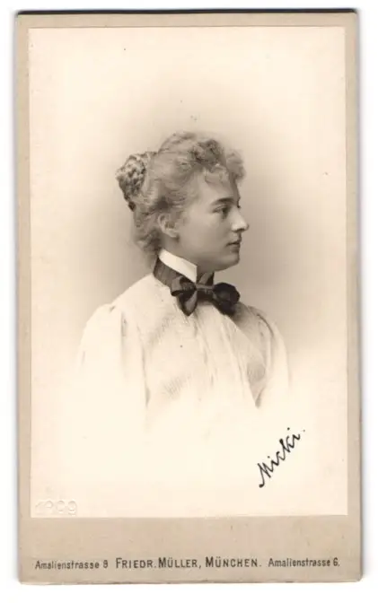 Fotografie Friedr. Müller, München, Amalienstr. 6, eine junge Frau im Profil mit Halsschleife